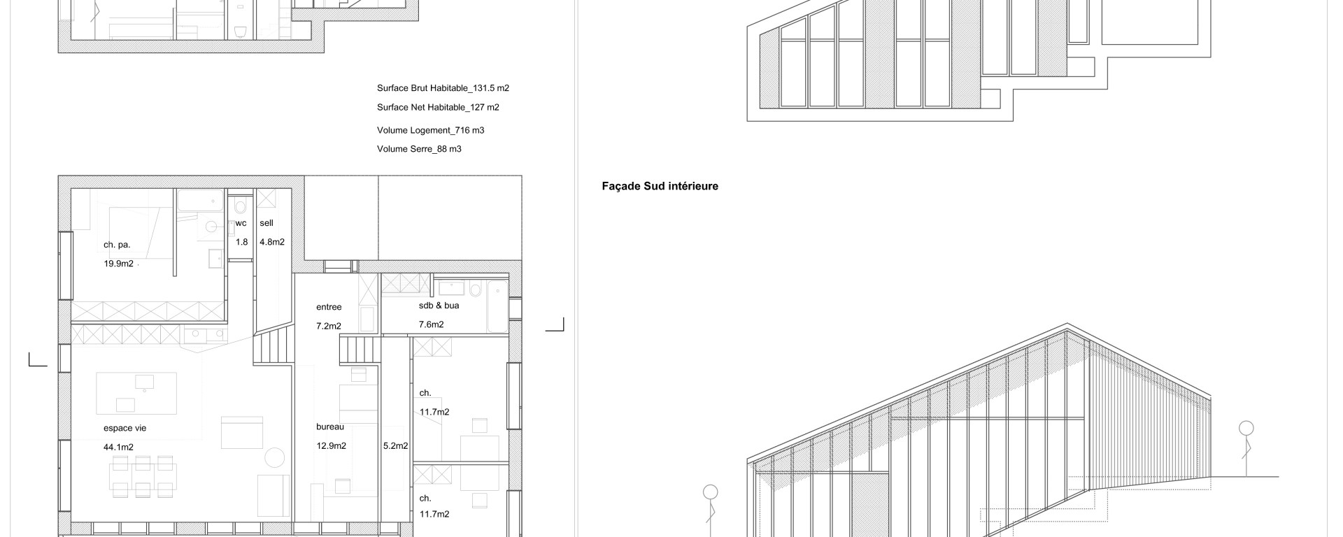 Sur la partie droite du document, nous voyons les façades de la serre intérieure (de la maison à la serre) et extérieure (de la serre à l’extérieur). Les parties blanches sont vitrées, les parties grisées sont en bois-paille-revêtement.