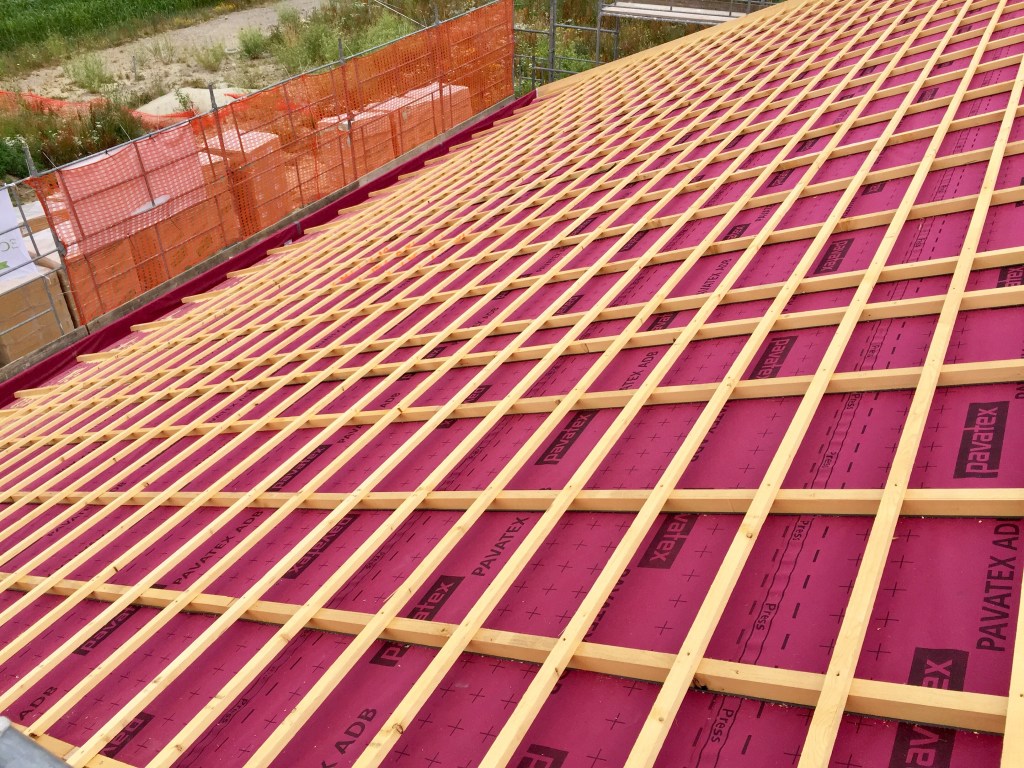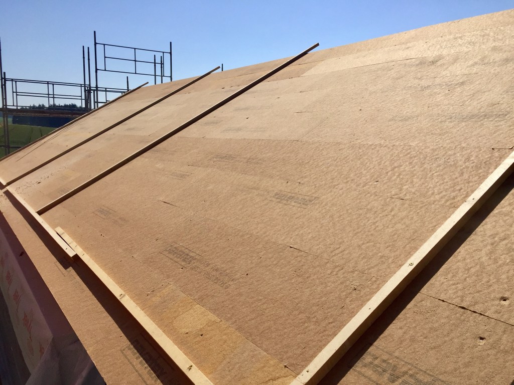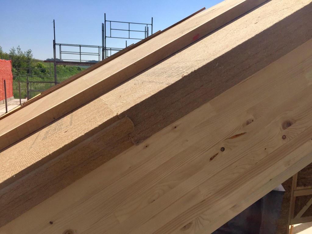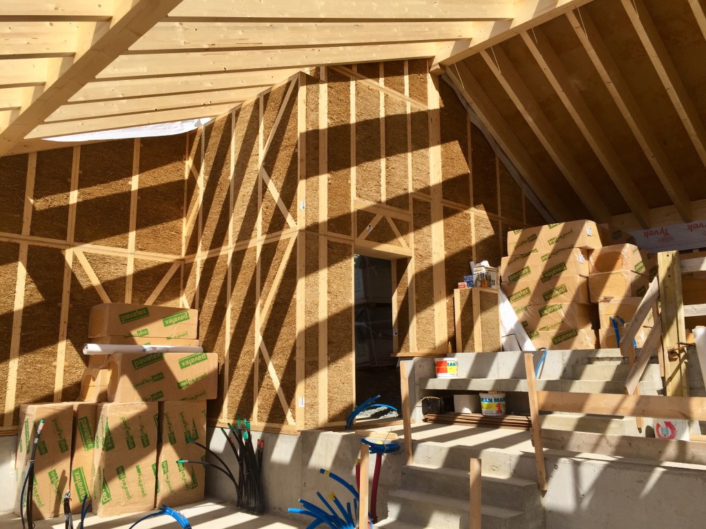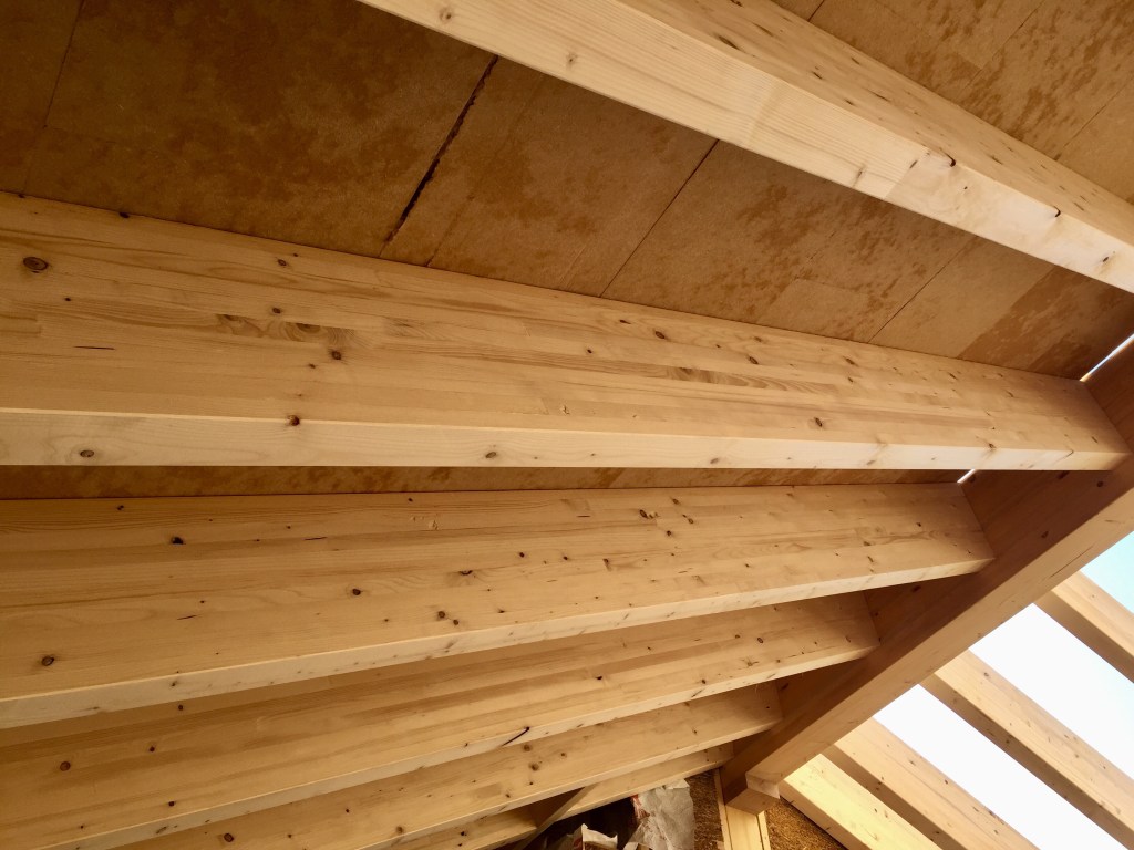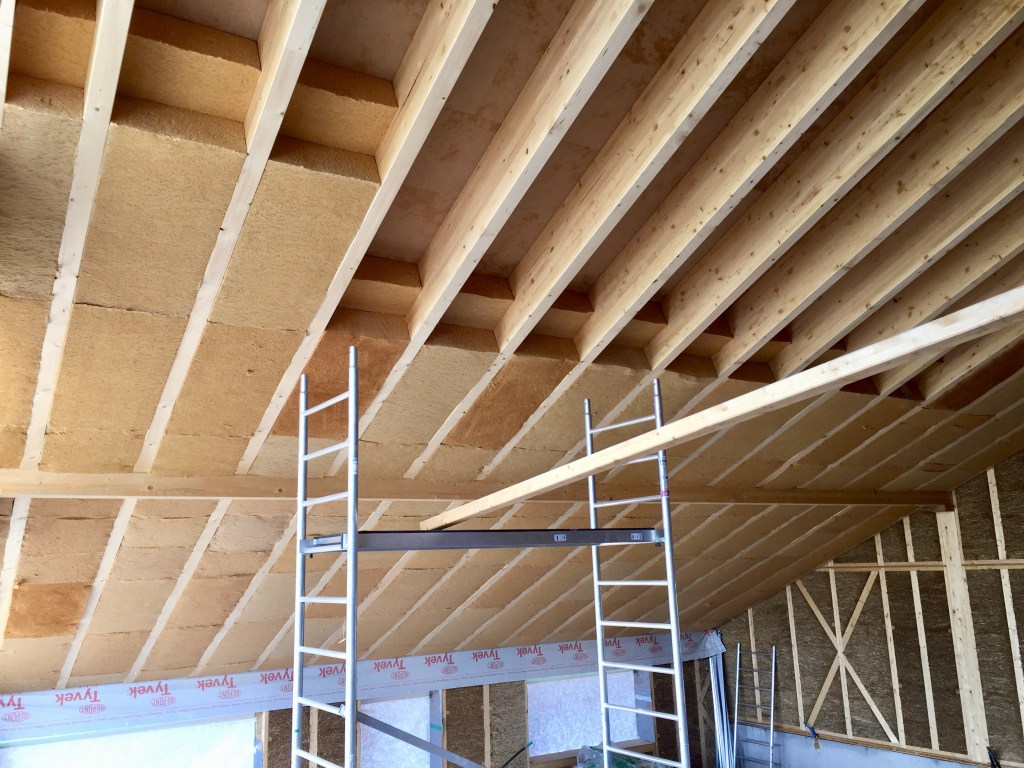 La charpente est terminée. Nous pouvons donc déposer la fibre de bois par-dessus.