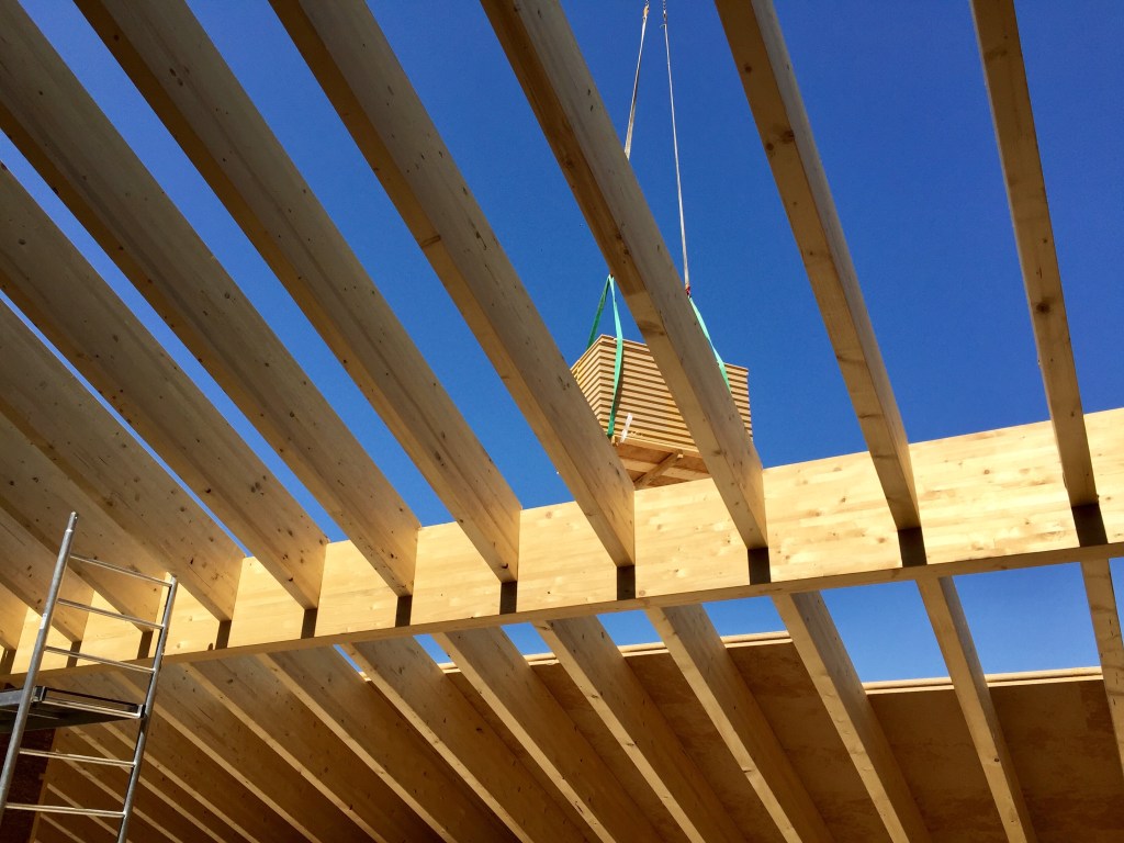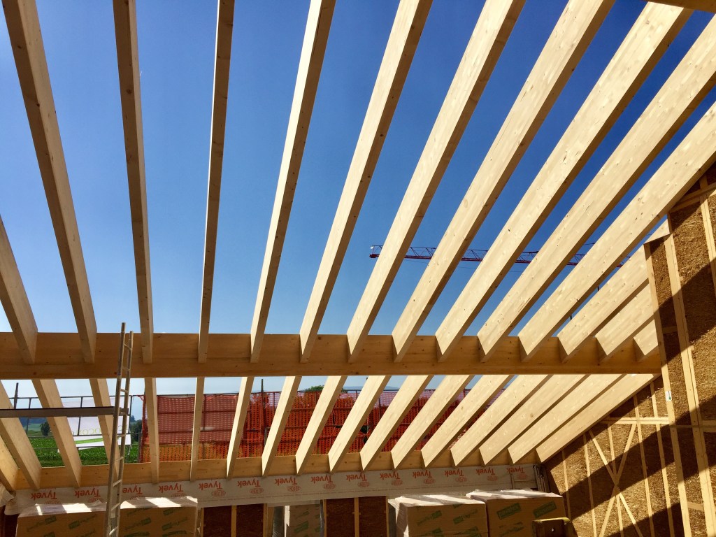 Actuellement, tout est installé sauf la ferblanterie et les tuiles avec les panneaux solaires photovoltaïques. C’est un bon moment pour montrer comment notre toit est composé entièrement de bois.