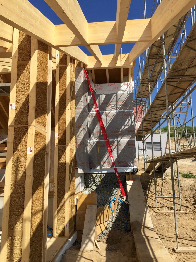 La laine de bois est ensuite recouverte d’un frein-vapeur. Le tout est bien emballé. Dans ce type de construction en bois et paille, il faut faire très attention à l’étanchéïté à l’air et à l’eau. Nous avons pris soin de retenir des produits recyclables, à défaut d’être naturel. Il faut faire des compromis à certains moments.