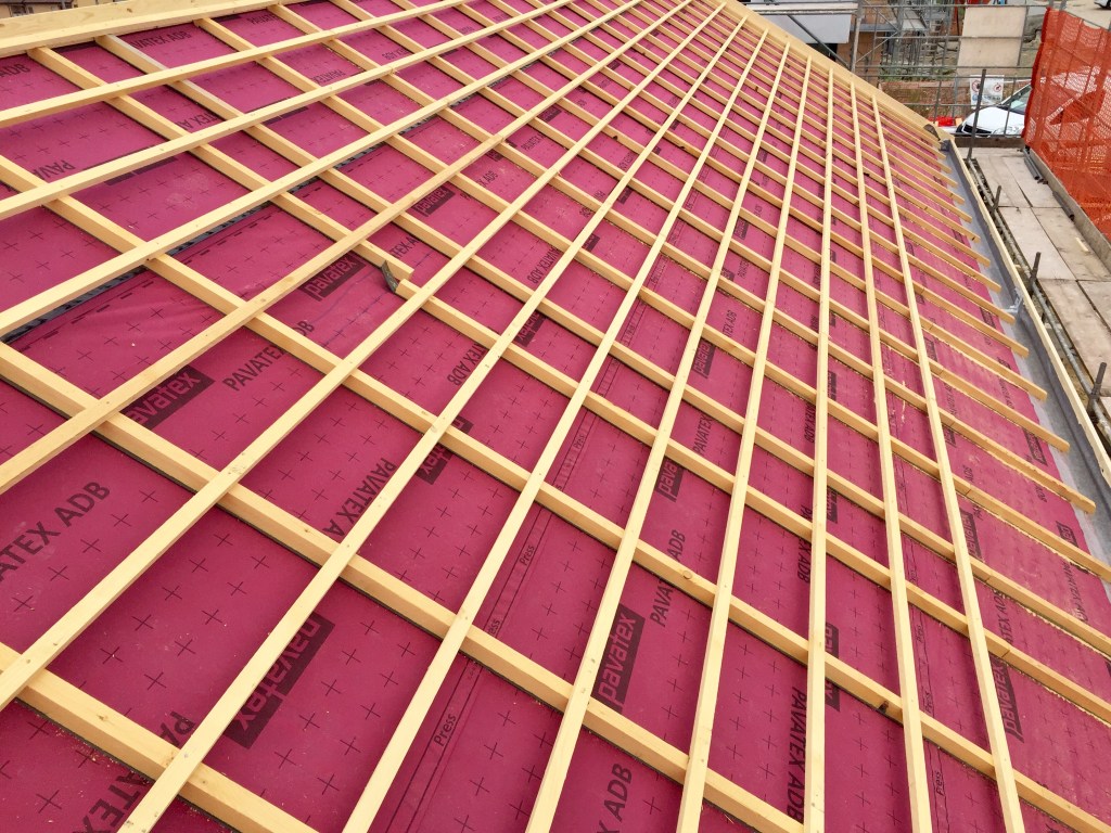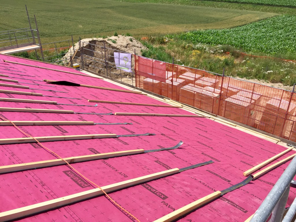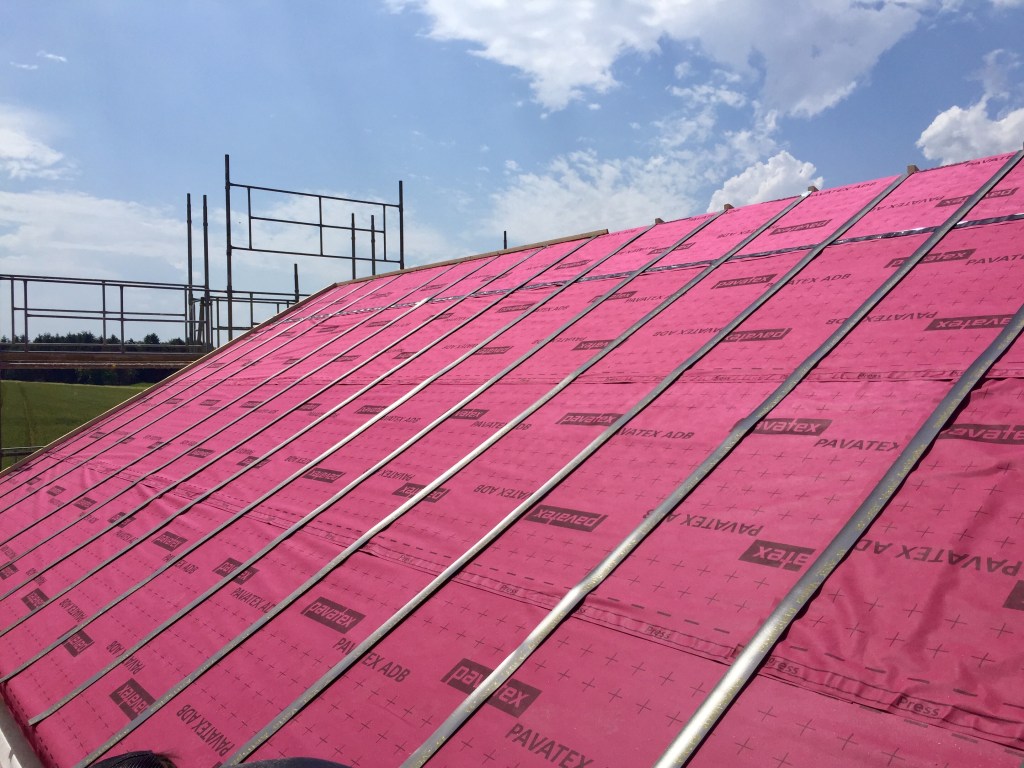 Par dessus la fibre de bois, la dernière couche avant les tuiles et les panneaux solaires photovoltaïques, sont installés des lés de sous-couverture. Ici, difficile de trouver des produits naturels. Le matériau utilisé est du polypropylène composite. Il est néanmoins recyclable, ce qui est une bonne nouvelle.
