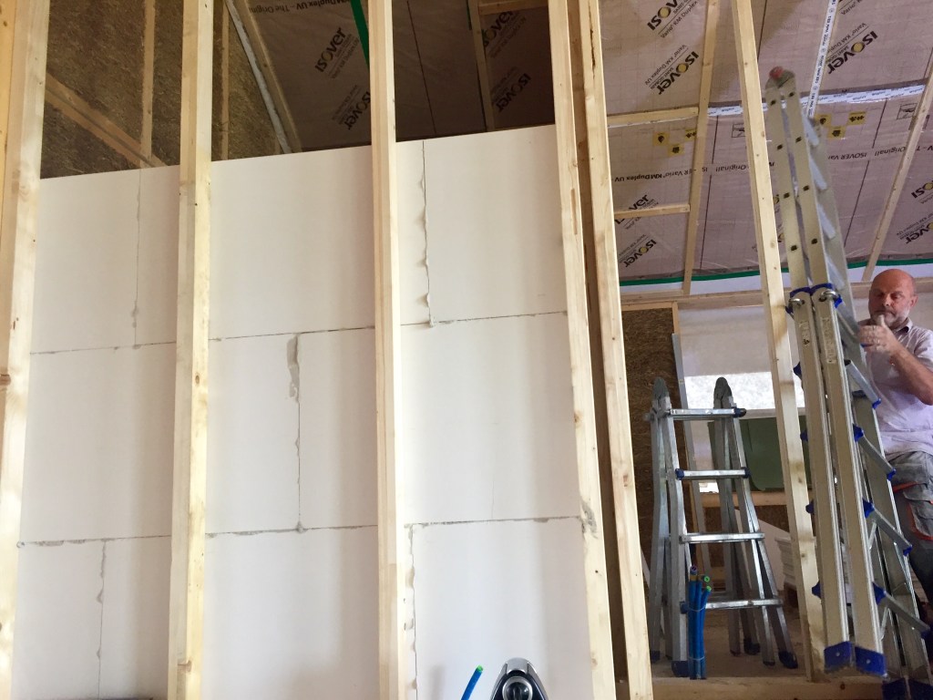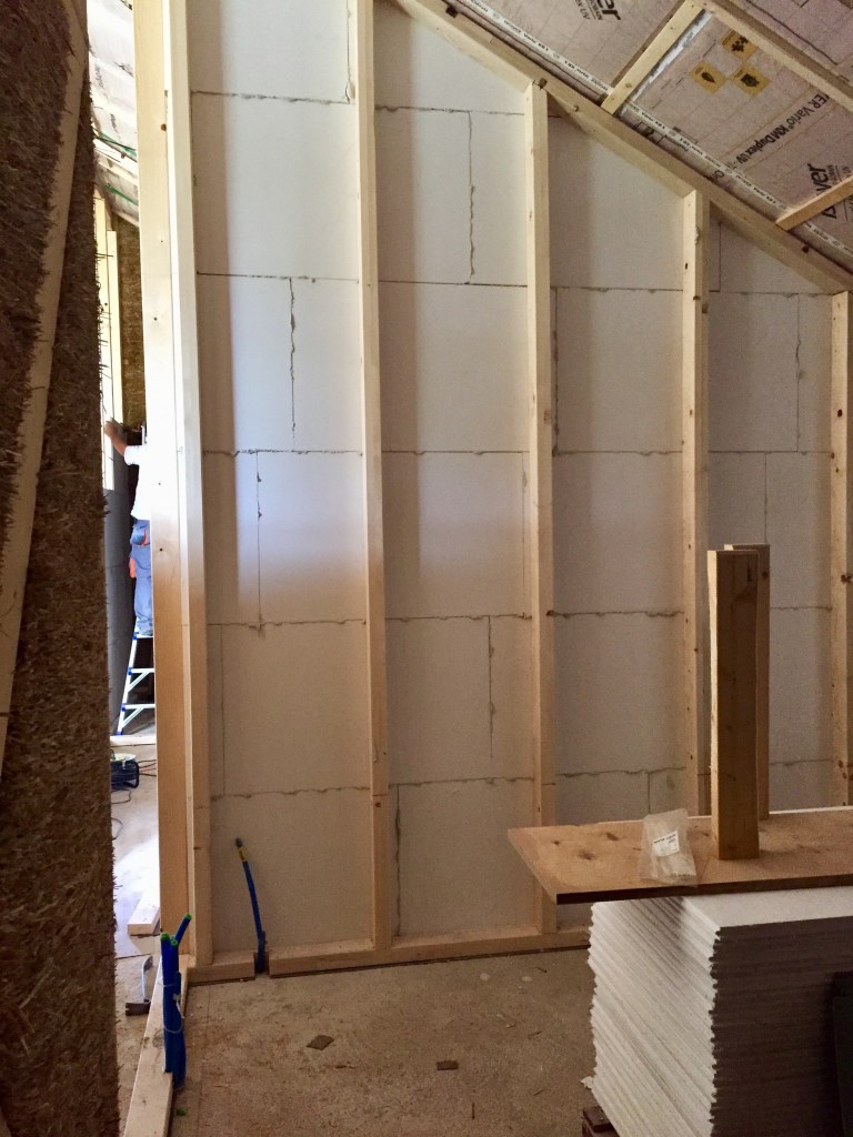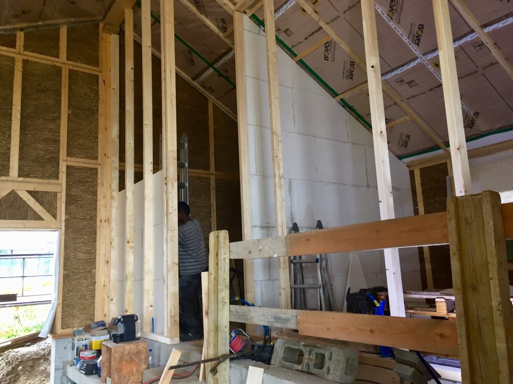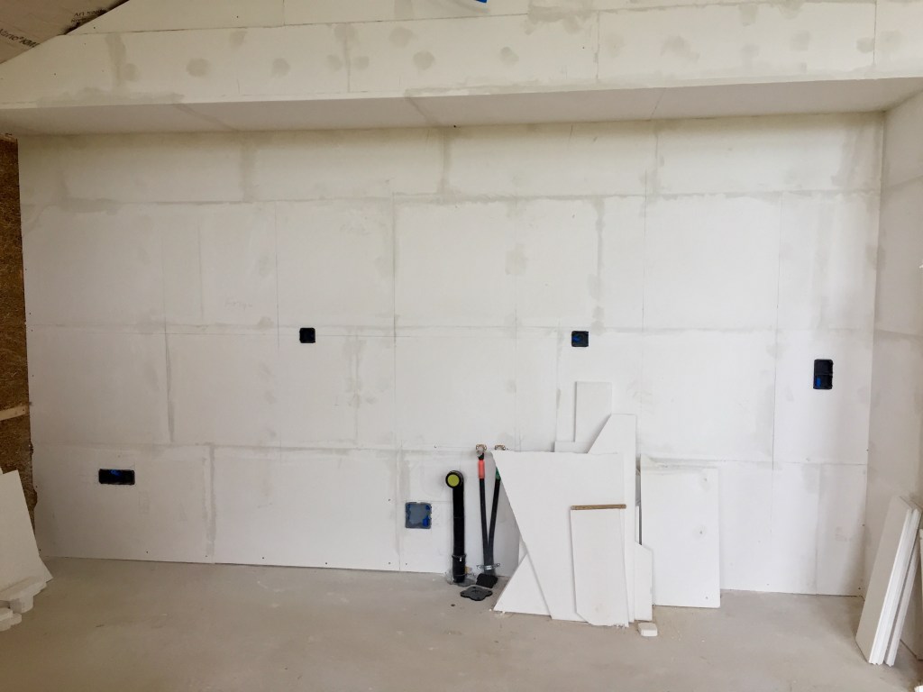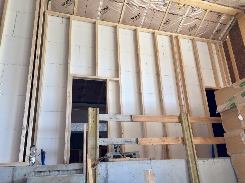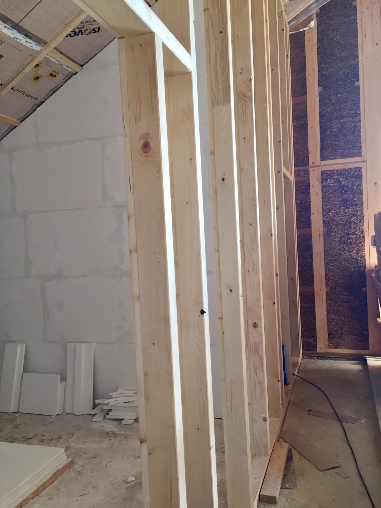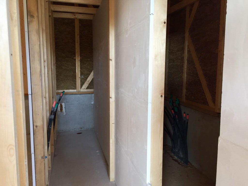 Une fois que l’électricité est installée dans les cloisons, elles peuvent être fermées. Nous n’avons qu’une seule photo pour l’instant, mais c’est nécessaire pour comprendre. Nous y voyons la laine de bois (pour l’isolation phonique) qui a été insérée avant de tout fermer.