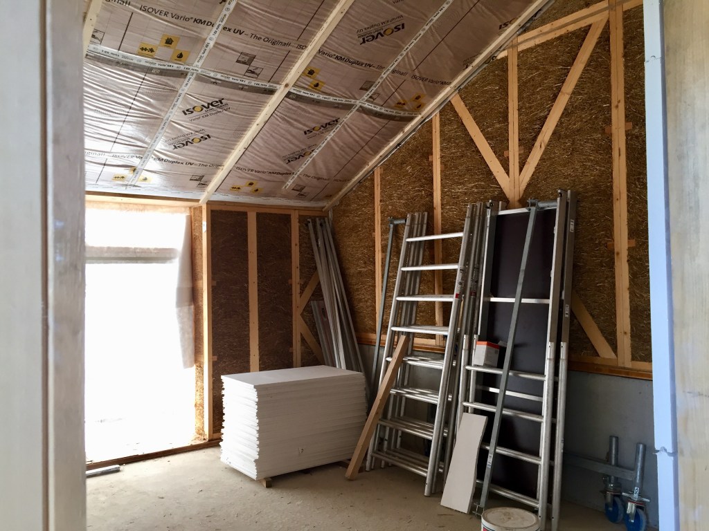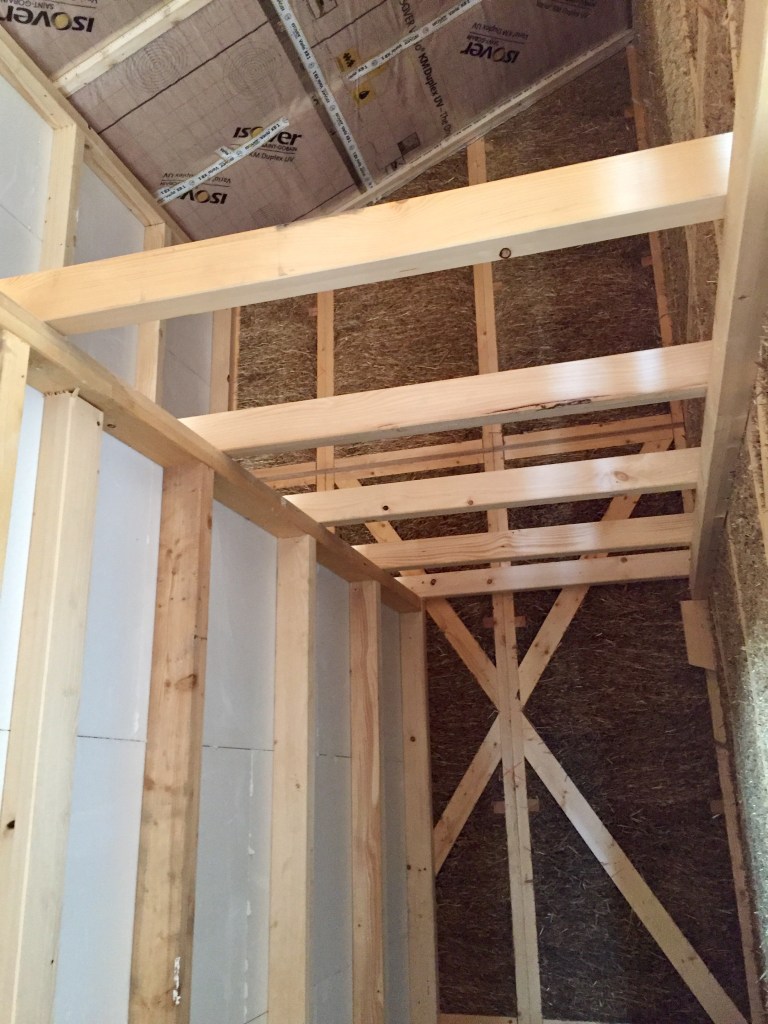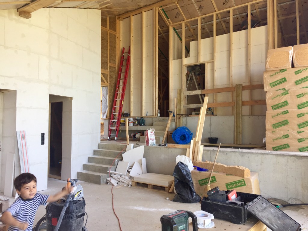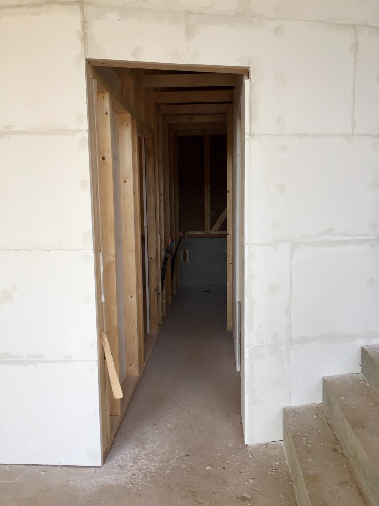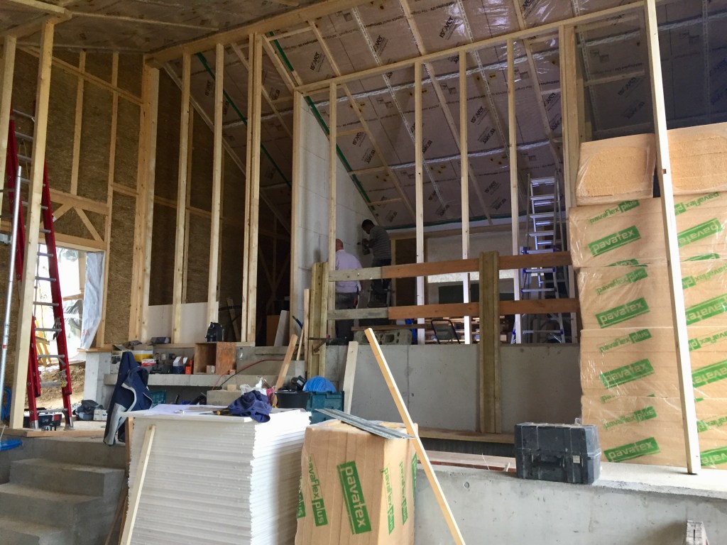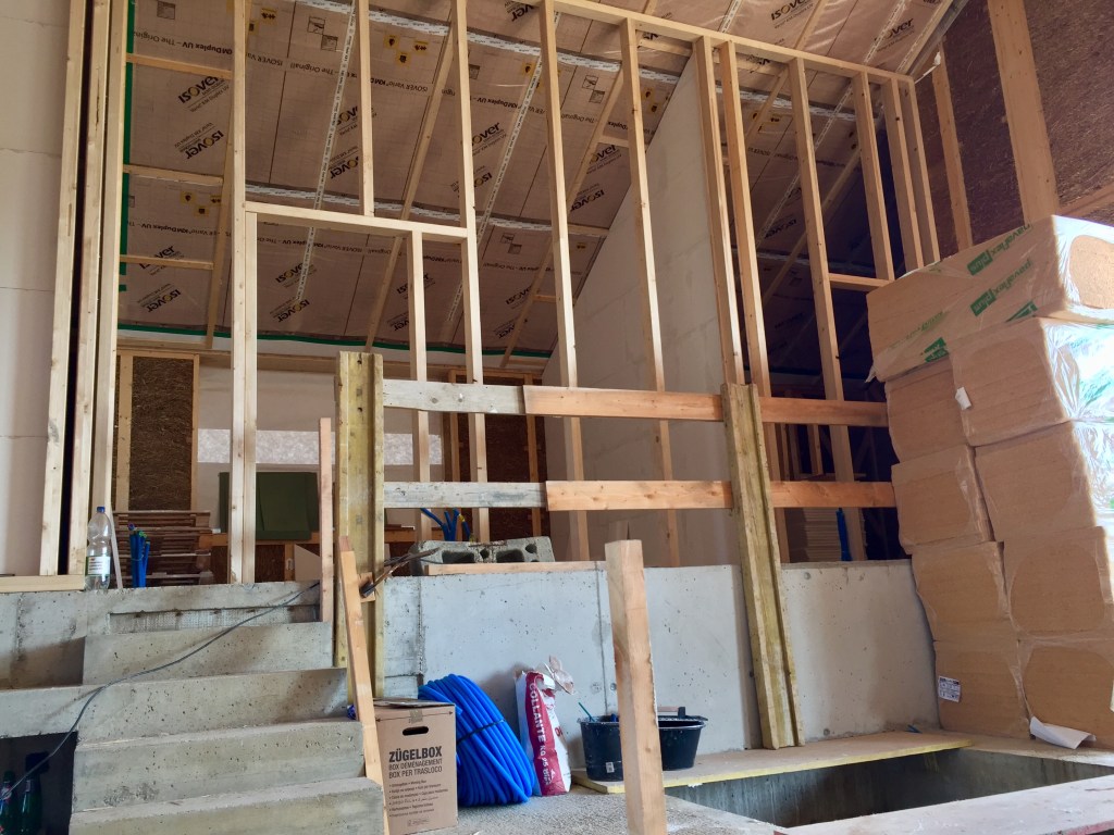 Une fois que l’électricité est installée dans les cloisons, elles peuvent être fermées. Nous n’avons qu’une seule photo pour l’instant, mais c’est nécessaire pour comprendre. Nous y voyons la laine de bois (pour l’isolation phonique) qui a été insérée avant de tout fermer.