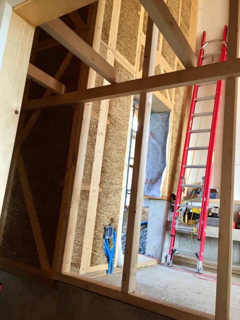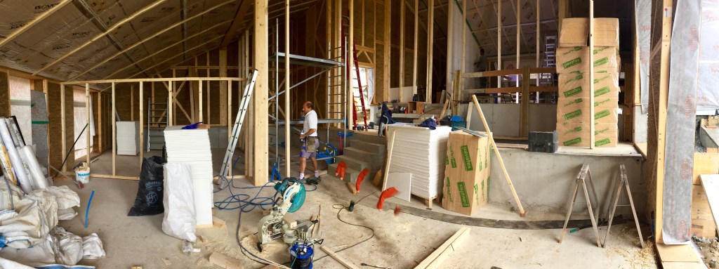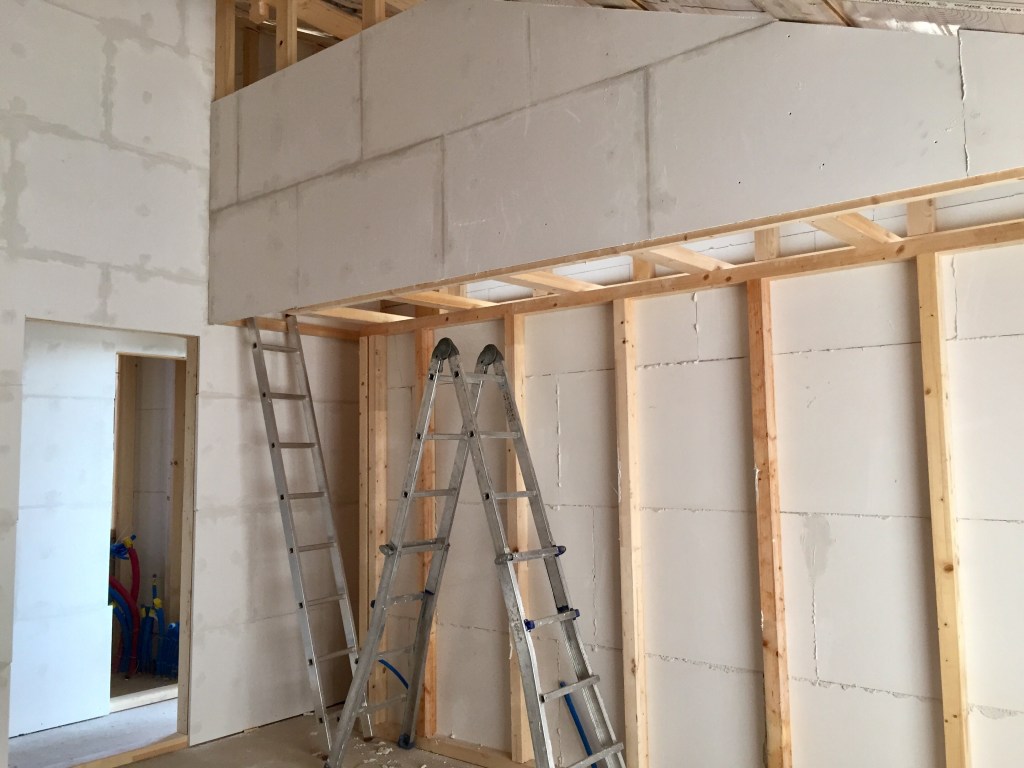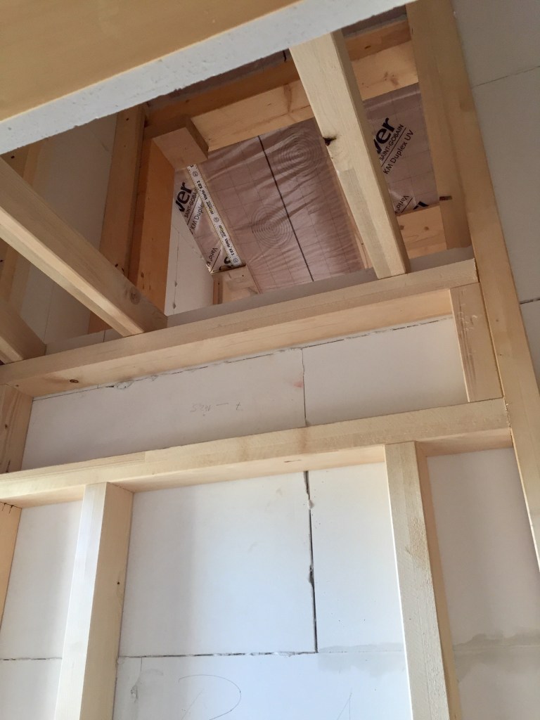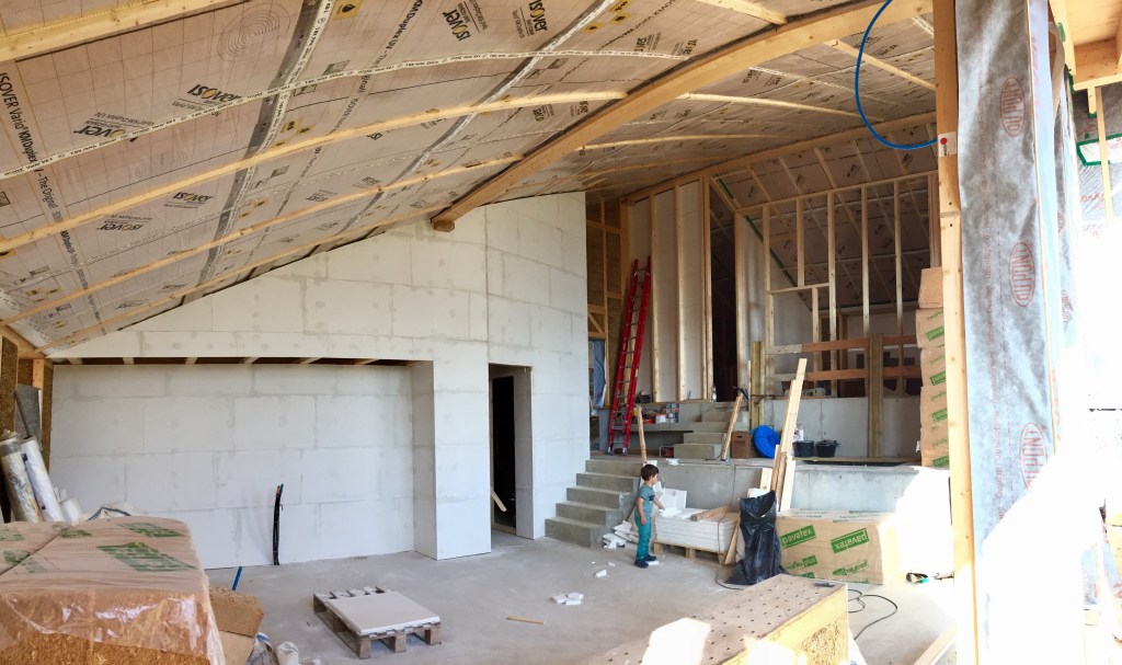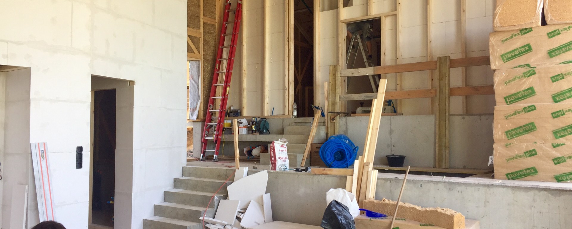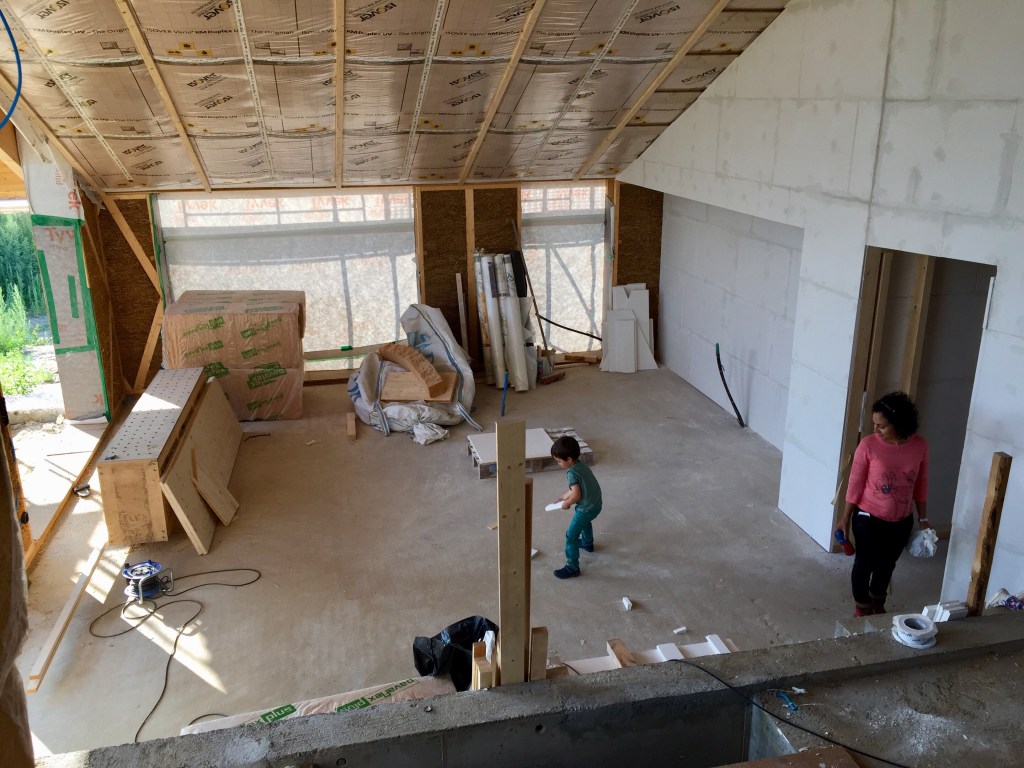 Une fois que l’électricité est installée dans les cloisons, elles peuvent être fermées. Nous n’avons qu’une seule photo pour l’instant, mais c’est nécessaire pour comprendre. Nous y voyons la laine de bois (pour l’isolation phonique) qui a été insérée avant de tout fermer.