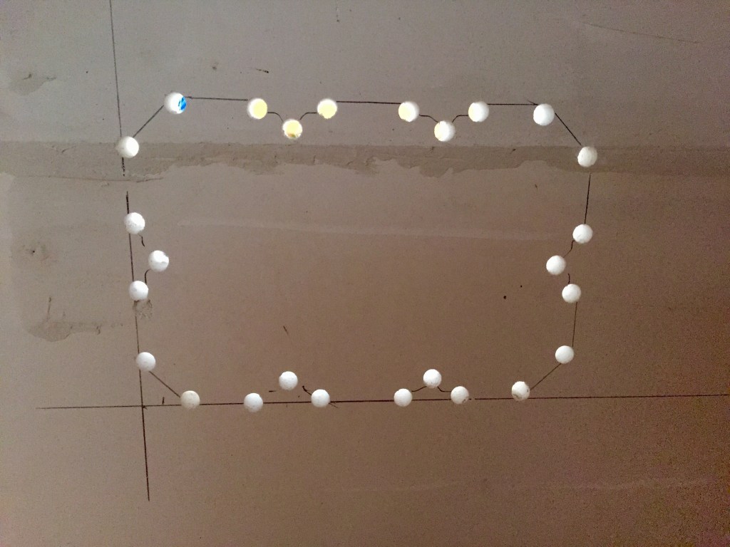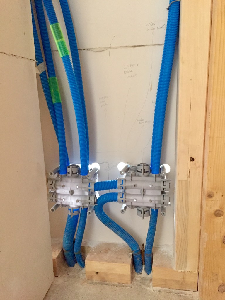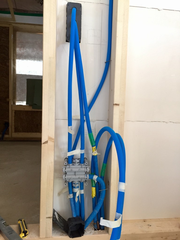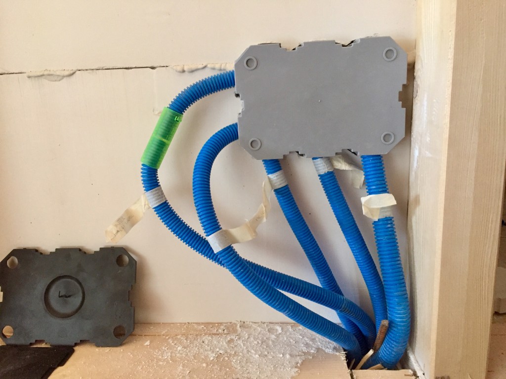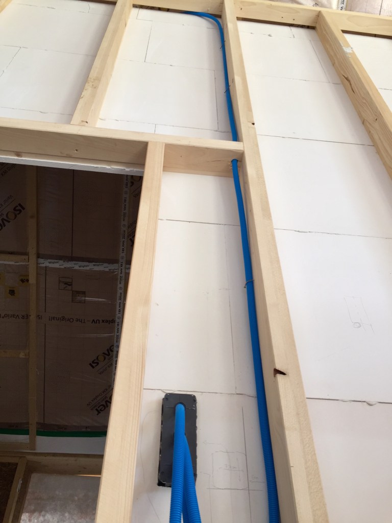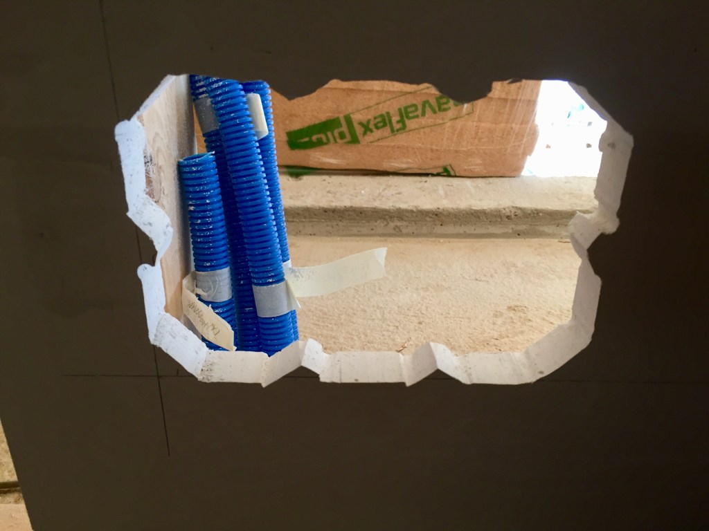 C’est le même principe que dans la paille sauf que tout est plus rigide. Nous découpons à la scie sauteuse la forme des boîtiers, puis nous les insérons, et nous gainons. Les gaines sont aussi fixées contre les montants en bois avec des clous, toujours pas besoin de colle ou de ciment. Selon les boîtiers, ça peut donner des découpes rigolotes :