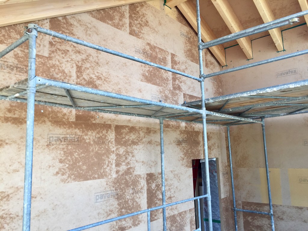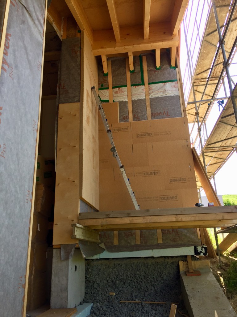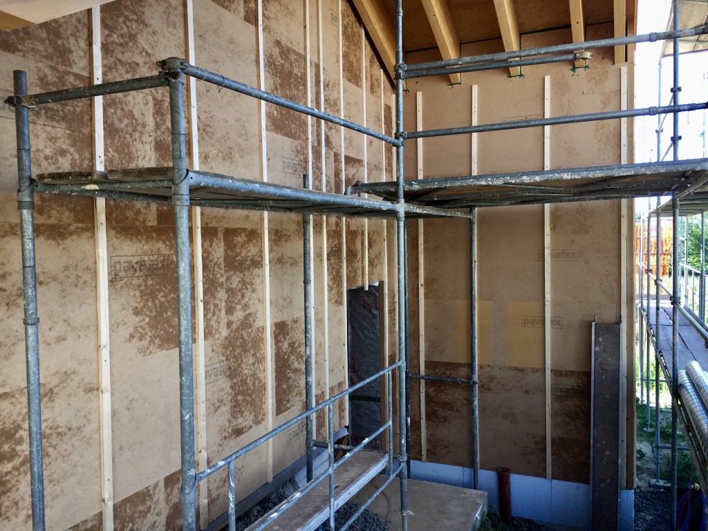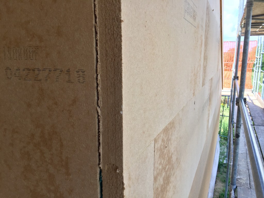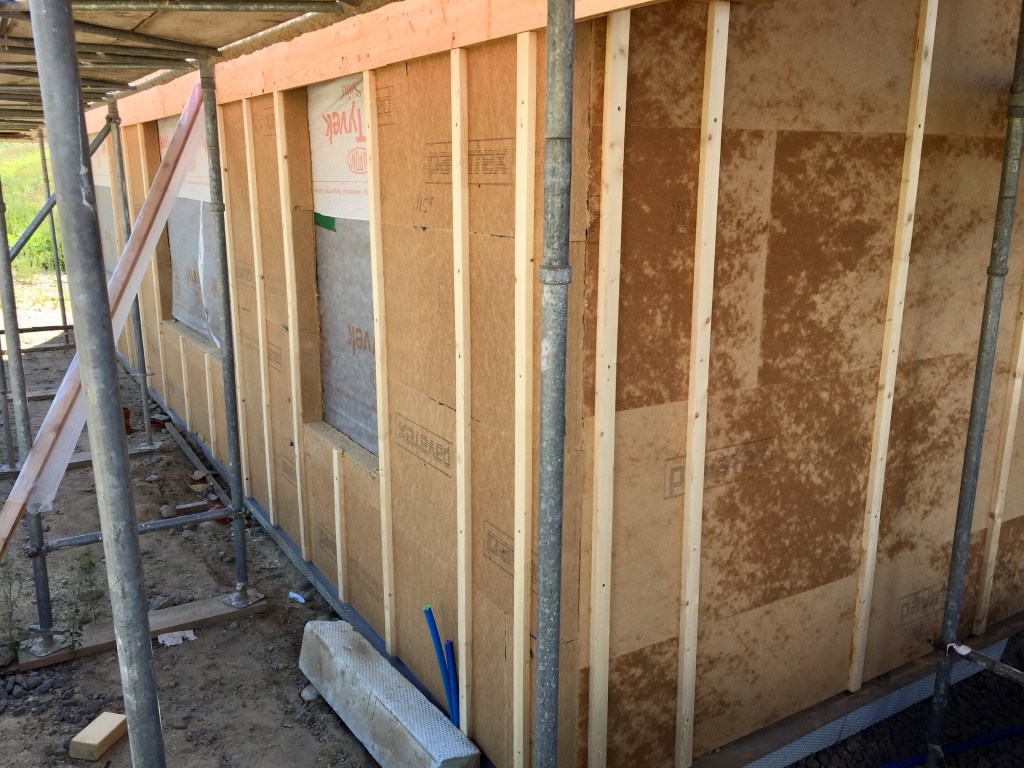 Quelques photos de la maison après la pose des plaques de fibres de bois sur l’extérieur :