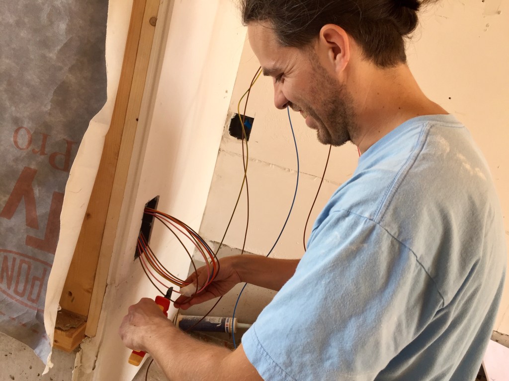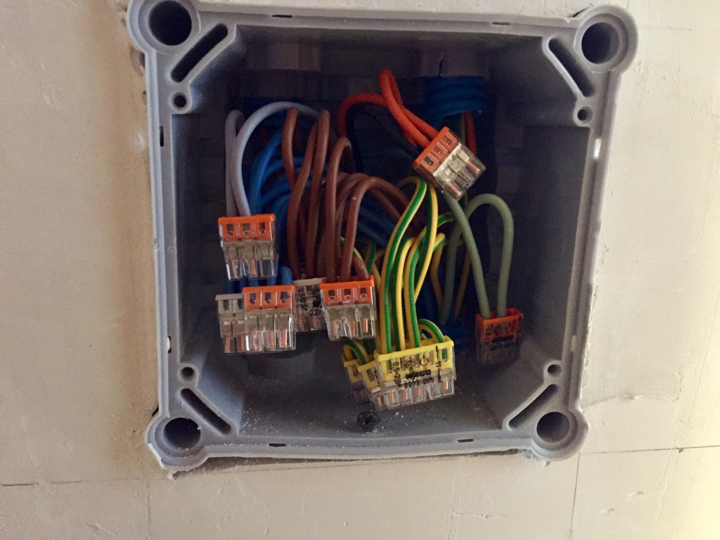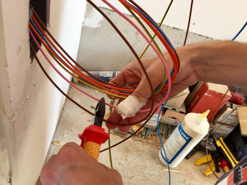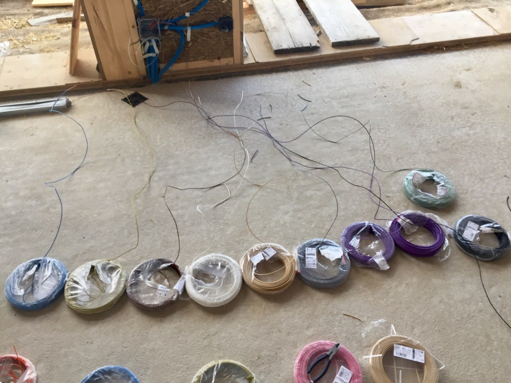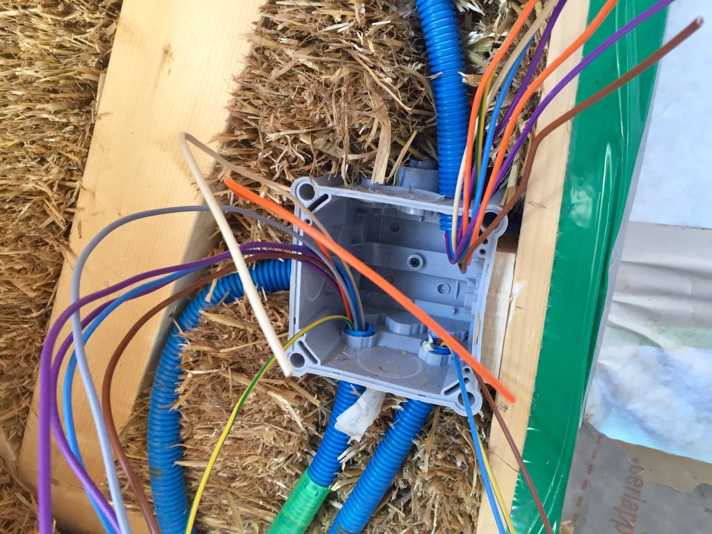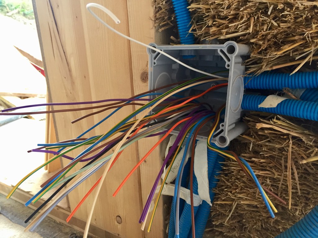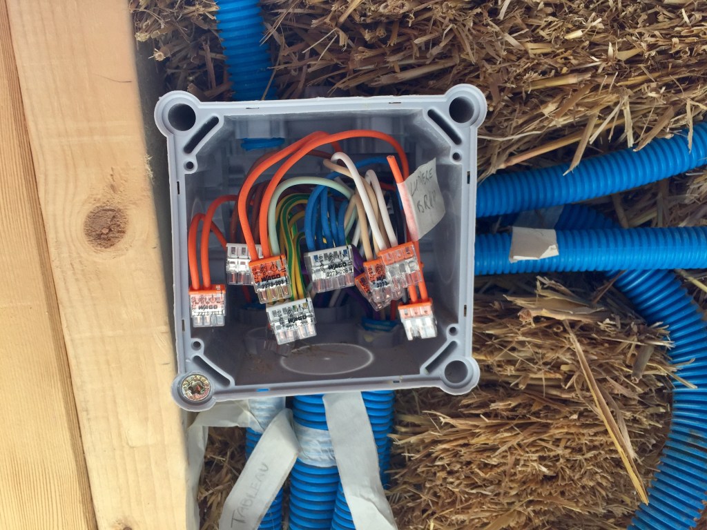 L’électricité a bien avancé grâce aux renforts des amis et de la famille ! Après avoir installé les boîtes et les gaines dans les murs en paille et dans les cloisons, après avoir tiré les fils dans les gaines, il faut maintenant tout connecter. Il faut aussi tirer les fils depuis les boîtes de dérivations vers le tableau. Attention, ça fait du monde et il ne faut pas se tromper !