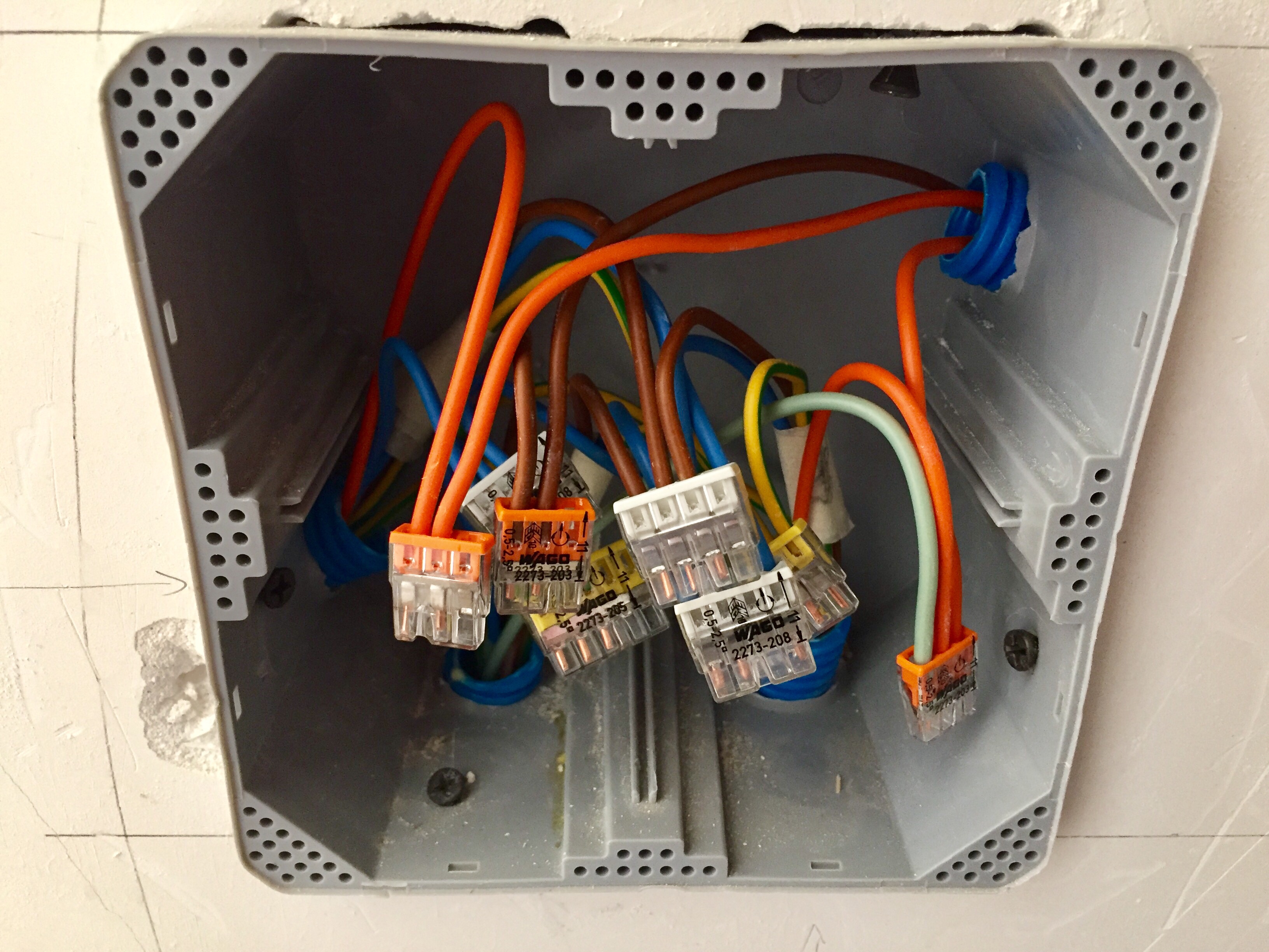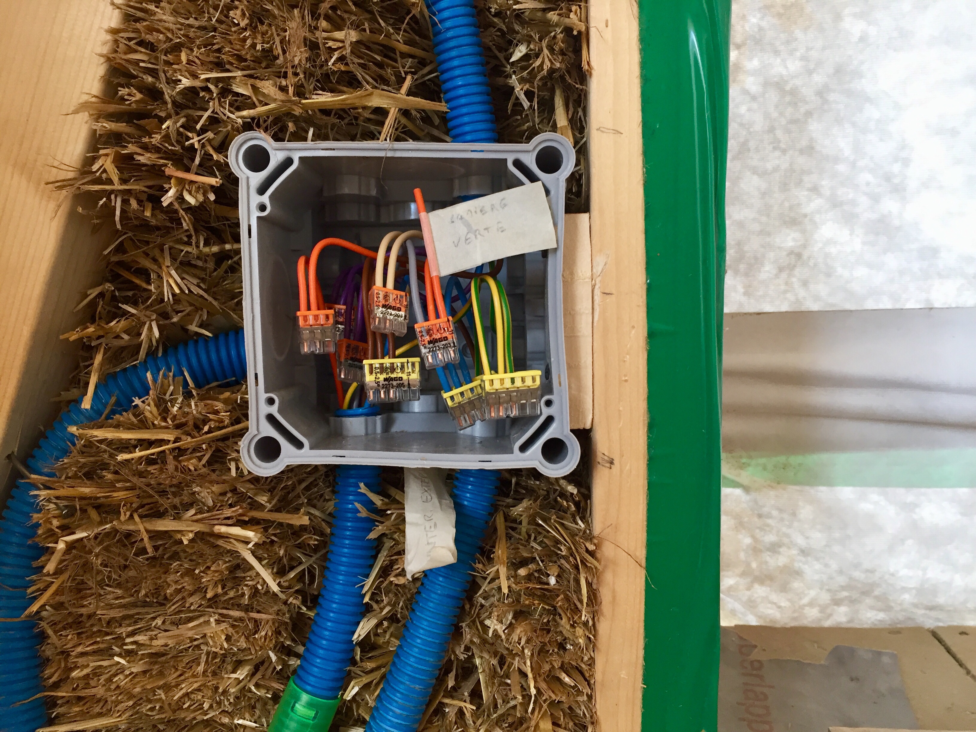 L’électricité a bien avancé grâce aux renforts des amis et de la famille ! Après avoir installé les boîtes et les gaines dans les murs en paille et dans les cloisons, après avoir tiré les fils dans les gaines, il faut maintenant tout connecter. Il faut aussi tirer les fils depuis les boîtes de dérivations vers le tableau. Attention, ça fait du monde et il ne faut pas se tromper !