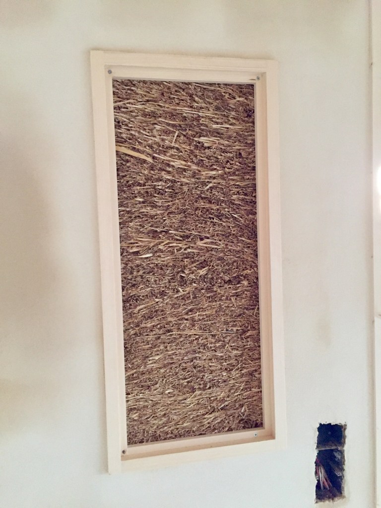Pour commencer, la fenêtre de vérité est terminée. Vous savez, ce cadre qui offre une vue sur la paille, pour prouver que la maison est bien construite en paille. C’est magnifique !