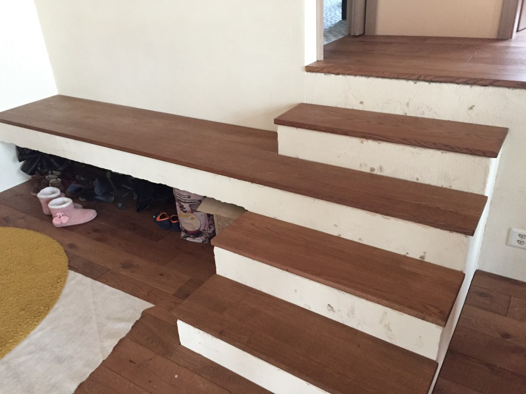 Dernière touche pour les escaliers : la couche de finition pour la terre sur les contre-marches. Normalement la semaine prochaine !