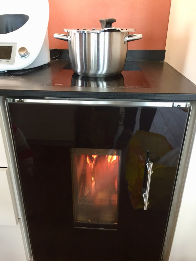 L’article sur le chauffage (ou l’absence de chauffage) dans notre maison est en cours d’écriture enfin écrit. Rapidement : nous n’avons pas de chauffage central. Nous cuisinons avec des plaques à induction, mais quand l’électricité nous fait défaut, alors nous avons une cuisinière à bois qui a trois rôles : cuisiner, chauffer l’eau chaude sanitaire, et chauffer la maison. Et c’est ce dernier point qui nous intéressait beaucoup ! La maison était complètement gêlée quand nous y sommes rentrés (autour de 5°C, 10°C le lendemain du déménagement). Pour la mettre à température, la cuisinière est essentielle.
