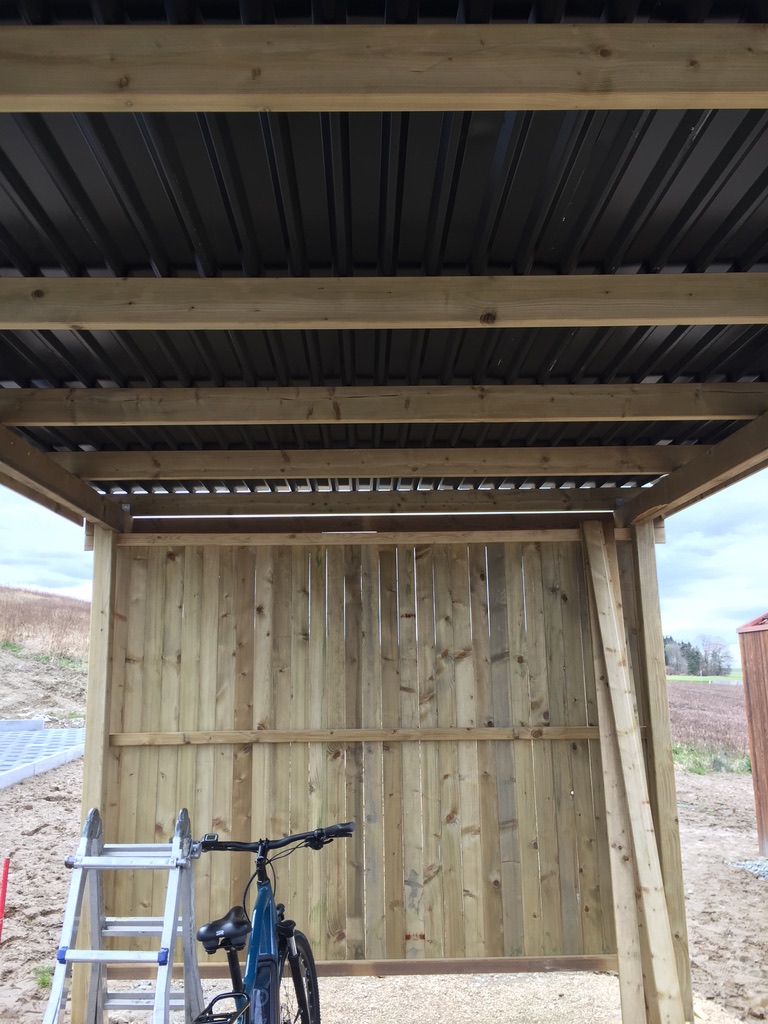Je ne me rappelle pas de la marque du couvert, mais ça n’a pas une très grande importance. Nous avons décidé de choisir un couvert en bois avec un toit en tôle ondulée. Pas de fondations lourdes en béton, simplement du tout-venant fortement tasser. Nous aurons une couverture végétale au sol mais nous ne sommes pas encore sûr de la solution. Nous en reparlons de toute façon !