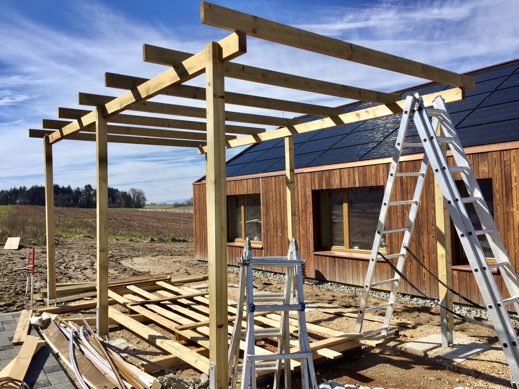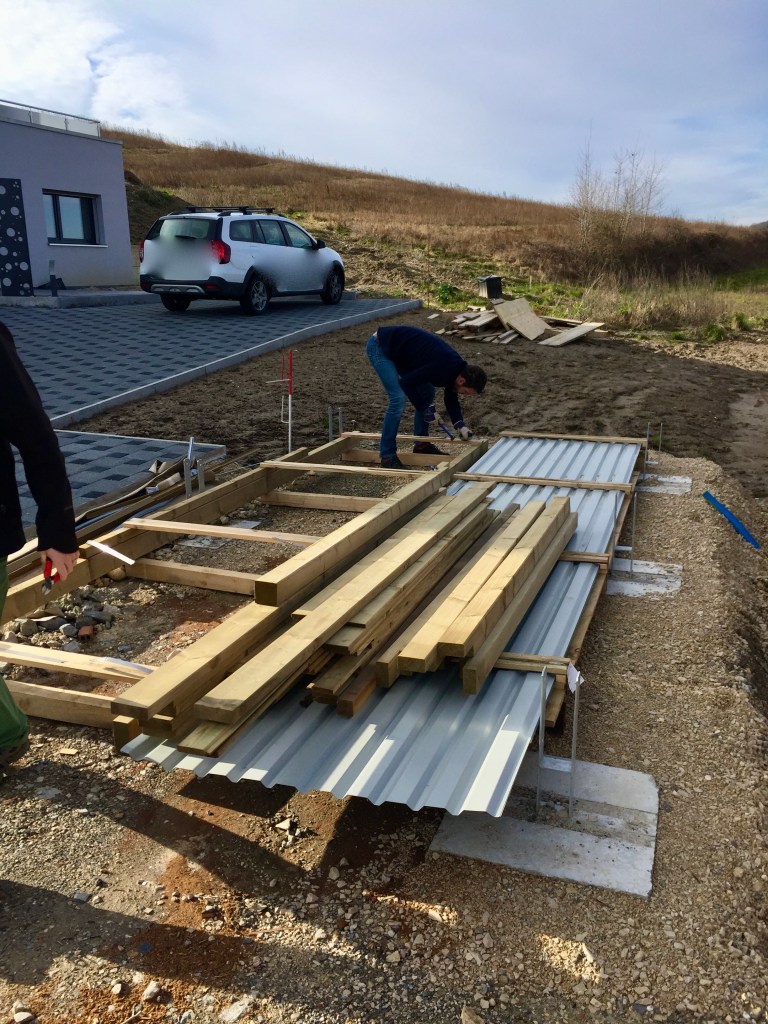 Nous avons construit le couvert à voiture. « Construit » est un bien grand mot, nous l’avons plutôt monté. Merci aux copains pour le coup de main ! C’est plus rigolo et ça va plus vite.