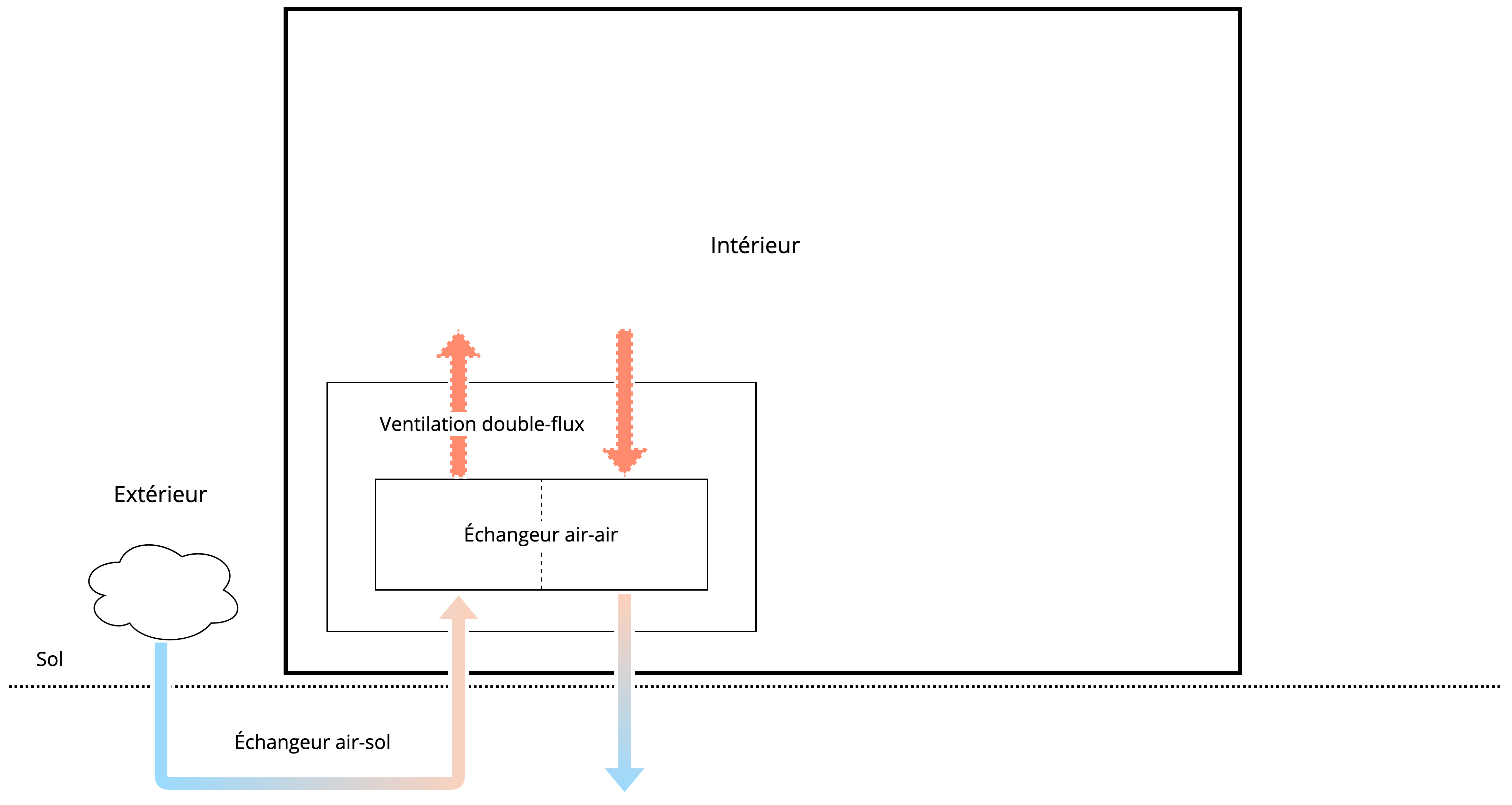 Imagineons qu’il fasse -15°C dehors, alors l’échangeur air-air de la ventilation double-flux avec son rendement de 90% offrira de l’air pulsé à 3.9°C. C’est peu. Il faudrait soit chauffer d’avantage l’air, avec un chauffage central par exemple, soit… préchauffer l’air avant son arrivée dans l’échangeur air-air ? C’est une idée !
