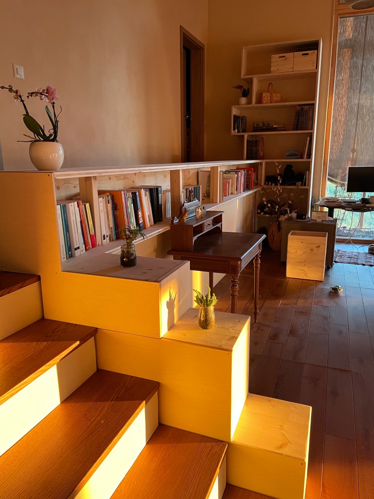 Une fois partiellement rempli, il commence à ressembler vachement plus à ce qu’on avait en tête ! Le meuble habit très bien le volume, il délimite aussi le couloir des chambres avec le reste de l’espace, il offre énormément de rangements, très pratique… Nous sommes hyper content !