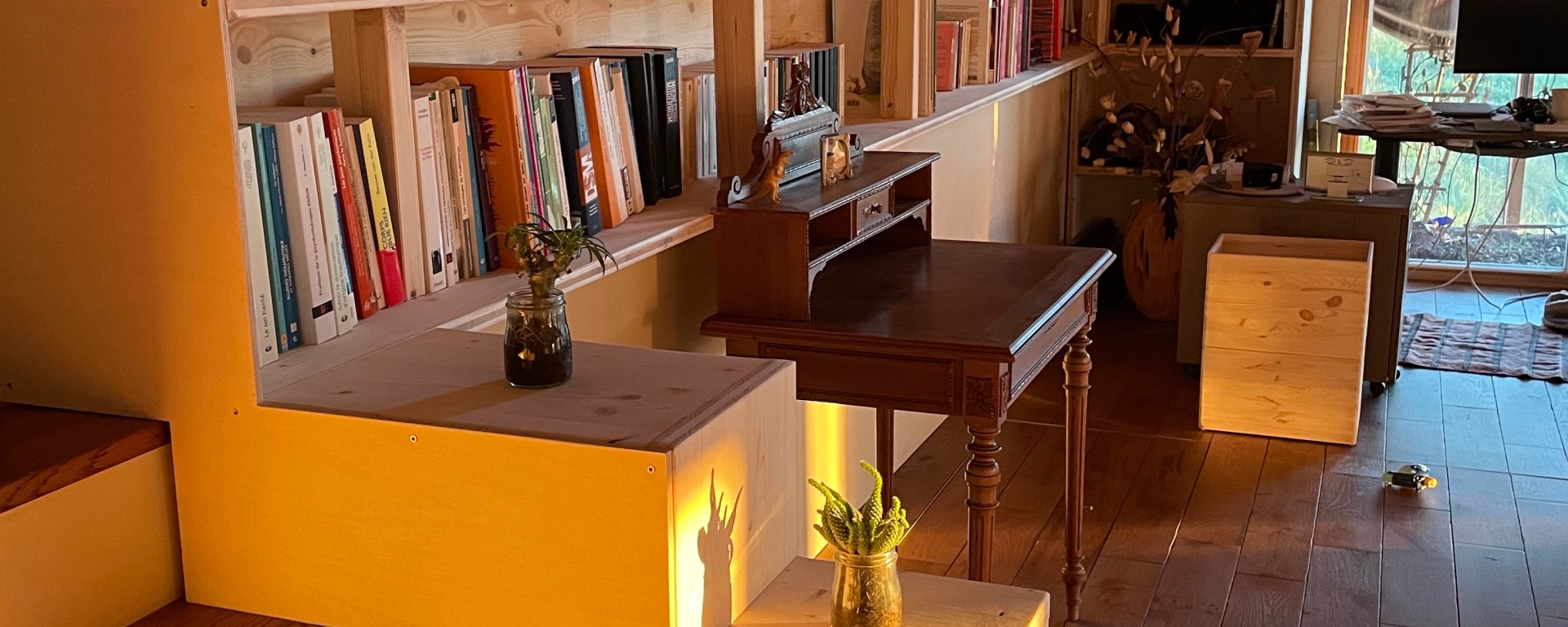 Une fois partiellement rempli, il commence à ressembler vachement plus à ce qu’on avait en tête ! Le meuble habit très bien le volume, il délimite aussi le couloir des chambres avec le reste de l’espace, il offre énormément de rangements, très pratique… Nous sommes hyper content !