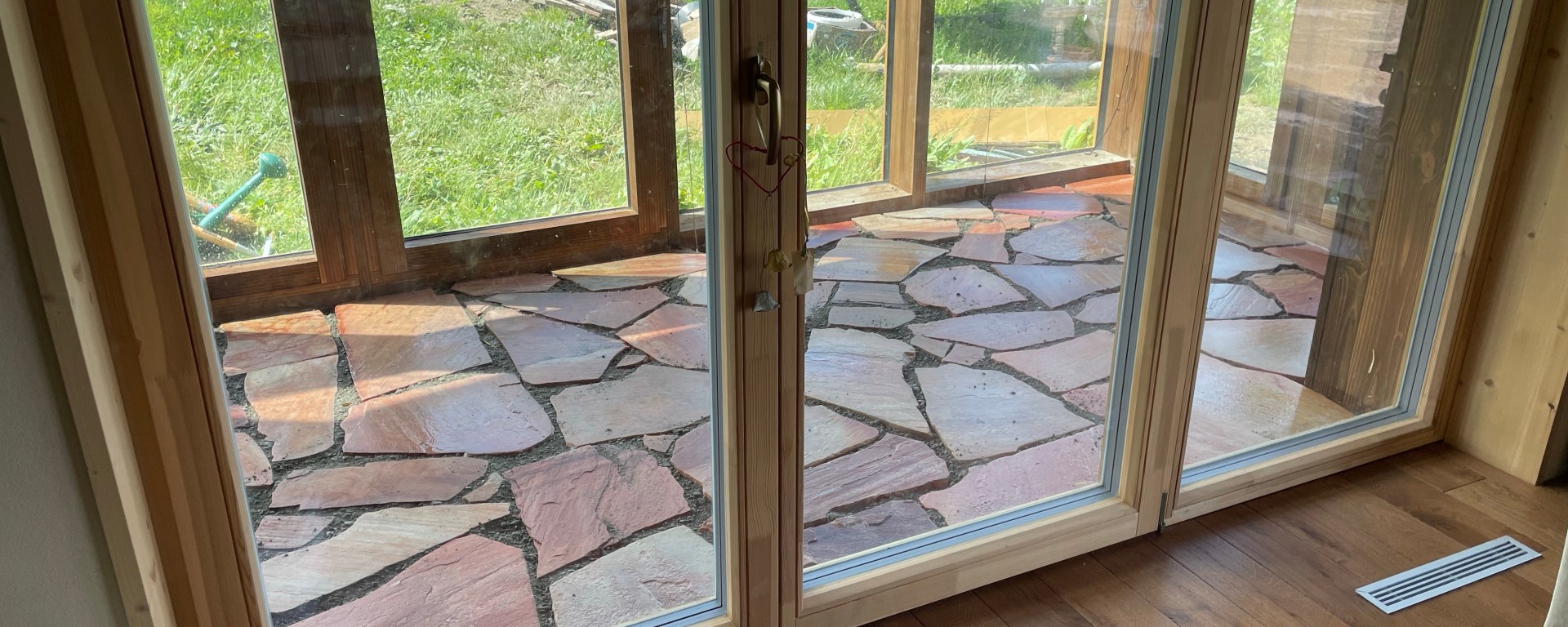Nous en profitons aussi pour daller une partie de la serre ! La majorité de la serre va rester en pleine terre, mais une partie en « dur » pourra être lavée plus facilement et apportera moins de saletés dans la maison. Nous aimons énormément le mélange des matériaux depuis l’intérieur de la maison : bois pour le parquet, pierre pour la serre, végétal pour l’extérieur, tout est harmonieux. (Et oui, la serre mérite d’être terminée, mais ça fait partie des chantiers à venir !).