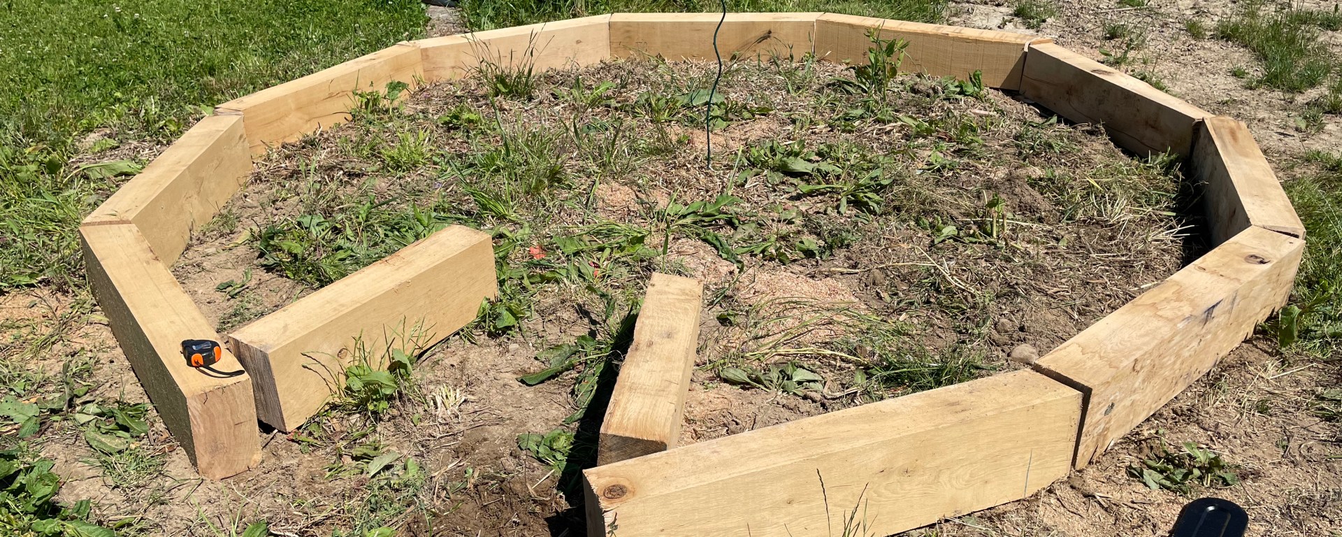 Avec ce chêne, c’est l’occasion de réaliser un cadre autour de notre potager extérieur principal, et d’utiliser les chutes pour faire un escalier ! Et c’est parti…